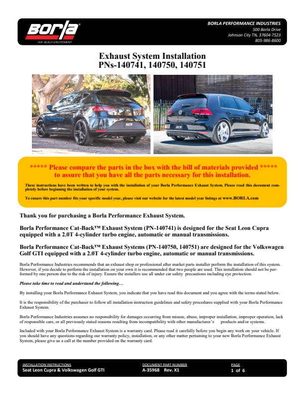 This vehicle NOT sold in North America. This system features 2.75" brushed T-304 stainless steel tips with laser etched BORLA(r) logo. BORLA(r) Cat-Back(tm) & Axle-back exhaust systems feature patented straight-through and multi-core technology designed to unleash hidden horsepower. Increased exhaust velocity adds power, driving excitement, fuel economy, and the distinctive BORLA(r) Sound of Power respected by motoring enthusiasts everywhere. Each system is built from premium T-304 stainless steel, superior to T-400 series knockoffs (such as 409), to give you the absolute best in performance and durability. Ultra-smooth mandrel bends ensure maximum flow & power, and precision computer numerical control (CNC) manufacturing ensures an accurate fit. Best of all, BORLA(r) stands behind every system with a Million-Mile Warranty. Just what you'd expect from the world's most experienced (and most winning) exhaust brand.
